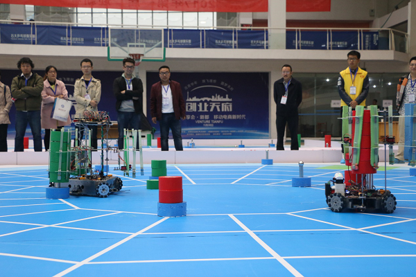 在熊猫乐园比赛现场,参赛机器人正在操作运转。它们在参赛选手们精心编程的程序控制下,拿起地标放在“竹子”上,去构建自己的熊猫乐园(标记V字形)。双方的机器人都表现出色,无论在机器人对地标的识别能力上,还是在构建熊猫乐园的耗时上,都让现场观众和工作人员折服。