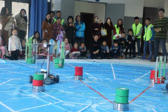 来访的小朋友和家长朋友们得到了电信院教工党员、学生党员以及志愿者们的热情接待。一行人首先来到明理楼C110教室,研究生陈浩通过演示发电实验现象,向大家展示了以以太阳能发电和风力发电为代表的新能源电力设备。之后,在靳涛老师的带领下,他们来到明理楼A211参观包括智能遥控车、智能巡线避障车在内的各类机器人,同时,靳涛老师还向大家演示了熊猫乐园机器人对抗活动。访问在精彩的炮车对抗视频中圆满结束。