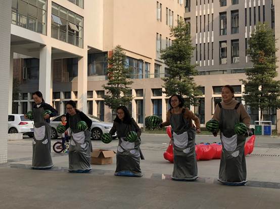 随后八名教师组成了“袋鼠运瓜”比赛队伍,穿上袋鼠服,站在各自点位,一个一个的“瓜”被八名老师以接力从起点顺利运到了终点,虽然在运瓜过程中很累,但是大家并没有放弃,坚持完成了所有“瓜”的运输。