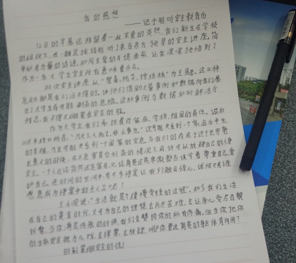 “事故之钟时时敲,安全之弦紧紧绷”这个思想在讲座完结后已植入2017级新生内心。在以班级为单位的感悟分享活动中,2017级班导生程涛同学结合自身经历谈了一下自己在踏入大学校园之初的一些情况,他也告诫新生们万事要以安全为先,特别是女生不要在夜晚独自出门。来自各专业的新生们在会后采访过程中也积极分享了自己的心得体会,他们说到的感想大致都有:通过倾听本次座谈会,了解到了很多所不知道的健康知识,也学到了很多安全防范技能。2017级电气工程及其自动化的范丽红同学还向采访者分享了她的手写感言,稚嫩的字迹里流露出的是她对安全健康教育更深一层次的理解。